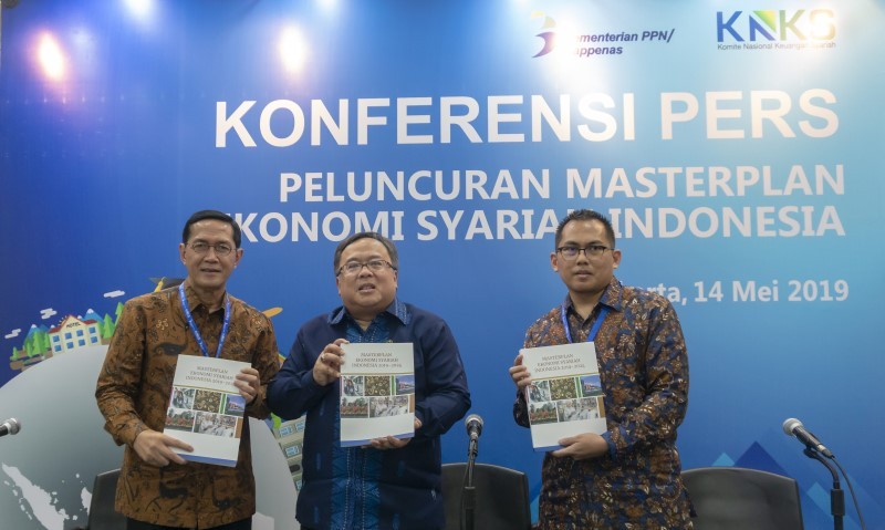 Menteri PPN/Bapppenas selaku Sekretaris Komite Nasional Keuangan Syariah (KNKS), Bambang Brodjonegoro, menjelaskan Masterplan Ekonomi Syariah Indonesia didampingi Ventje Rahadrdjo (Direktur Eksekutif KNKS) dan Afdhal Aliasar (Direktur Pengembangan Ekonomi Syariah dan Industri Halal)